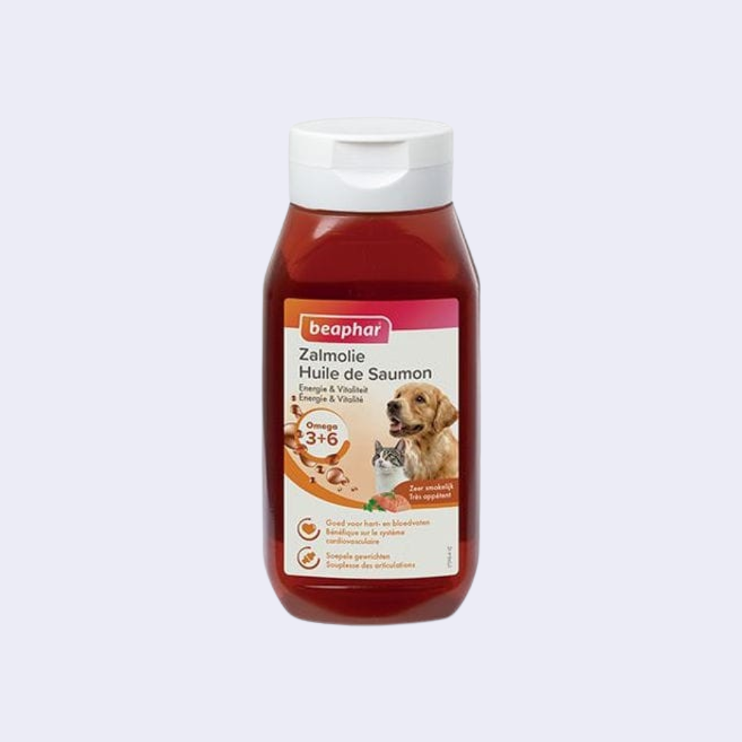 ’huile de saumon Beaphar apporte énergie aux chiens et chats. Elle provient de pêcheries durables. Cette huile contient des acides gras essentiels tels que l’EPA et le DHA et c’est une source d’acides gras Oméga 3 (17,4 %) et Oméga 6 (20 %).